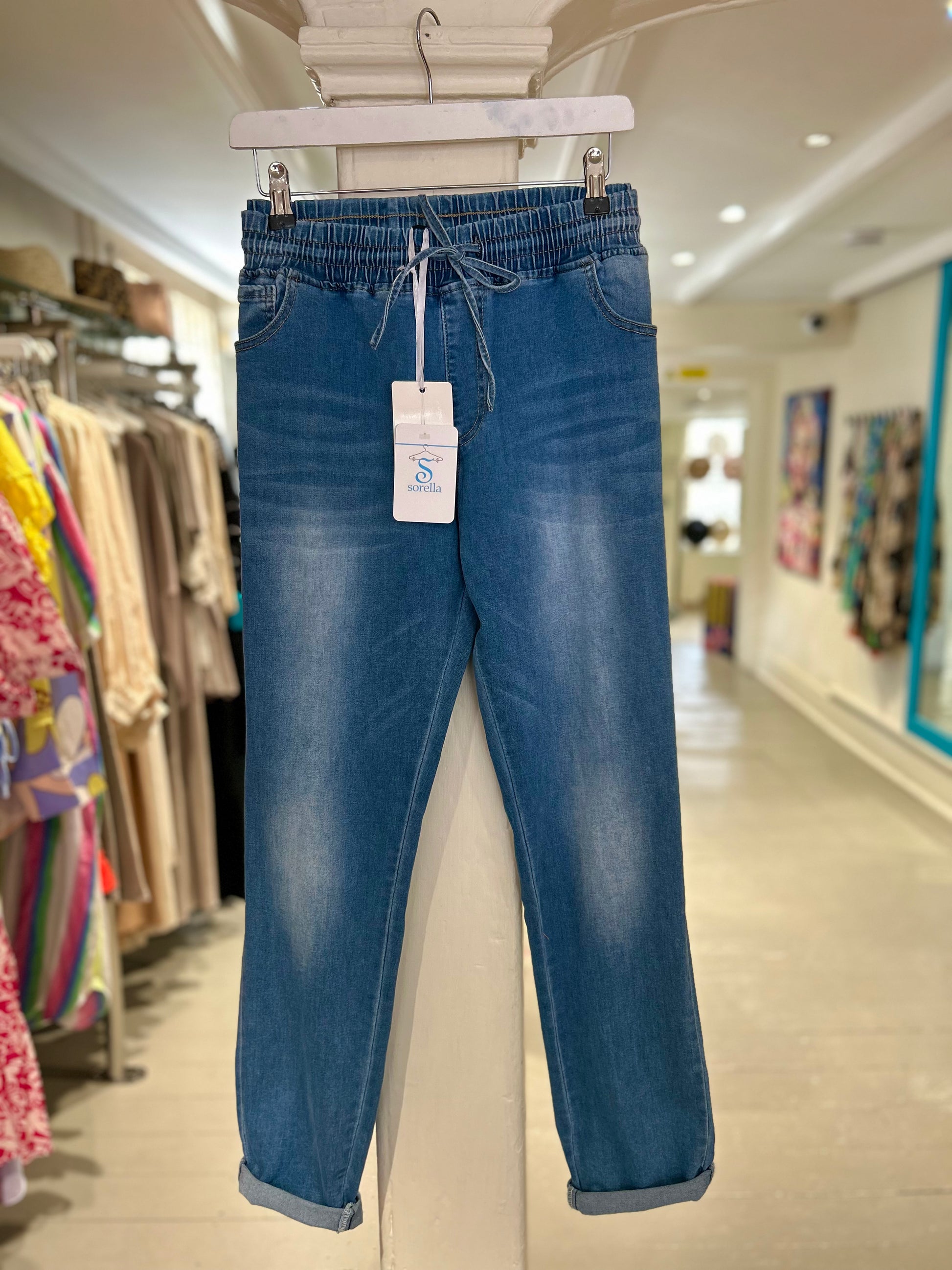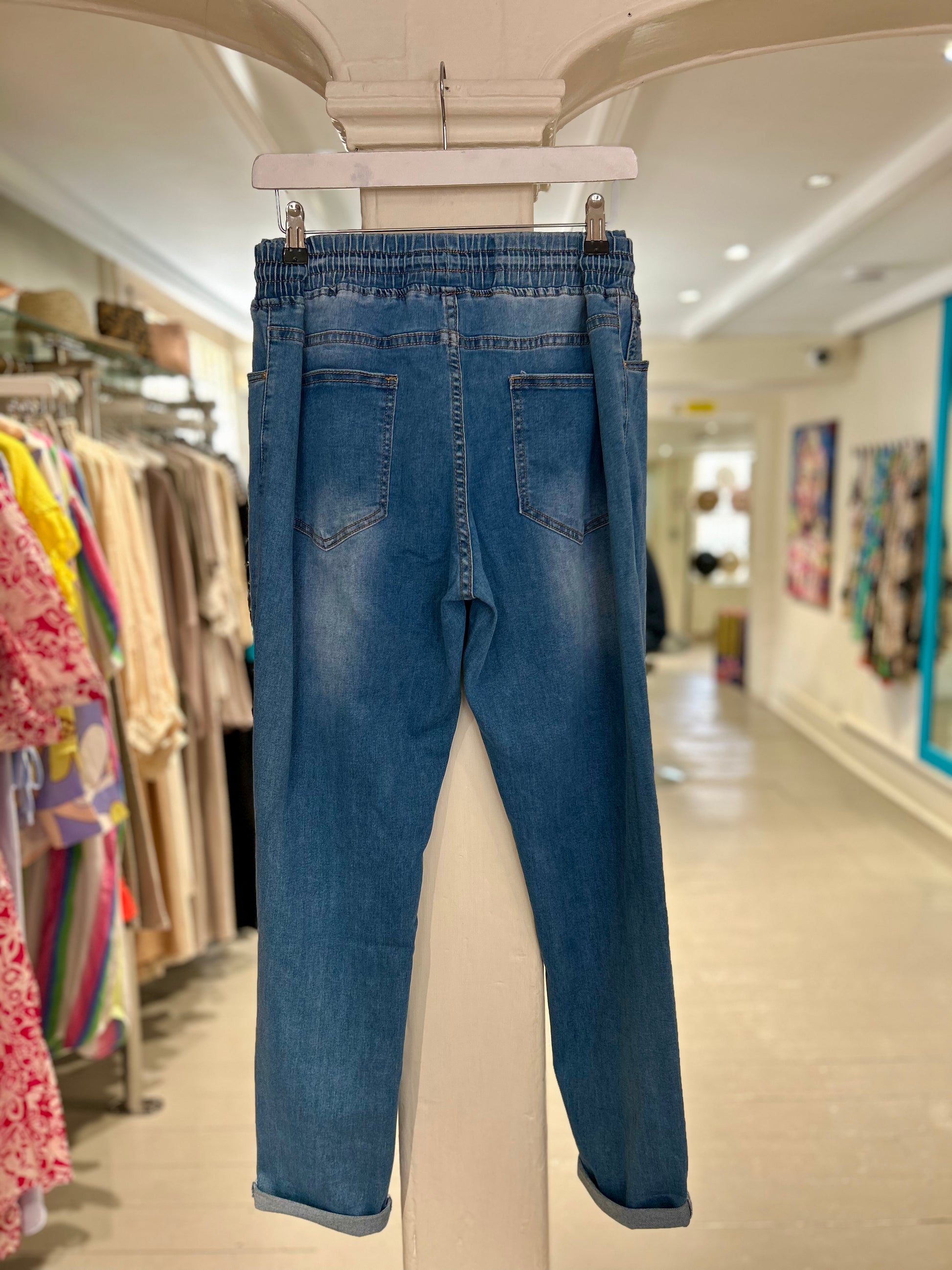 High Waisted Boyfriend Jeans with Elastic Waist - Mid Wash