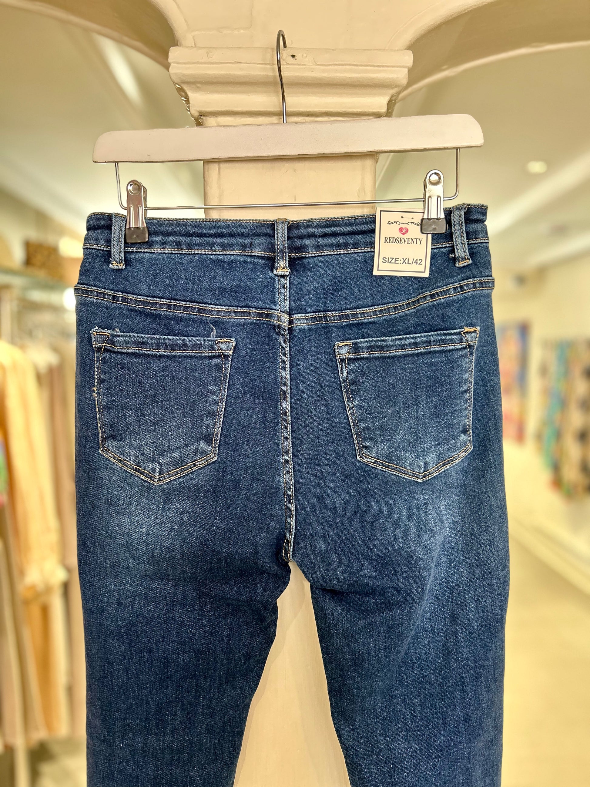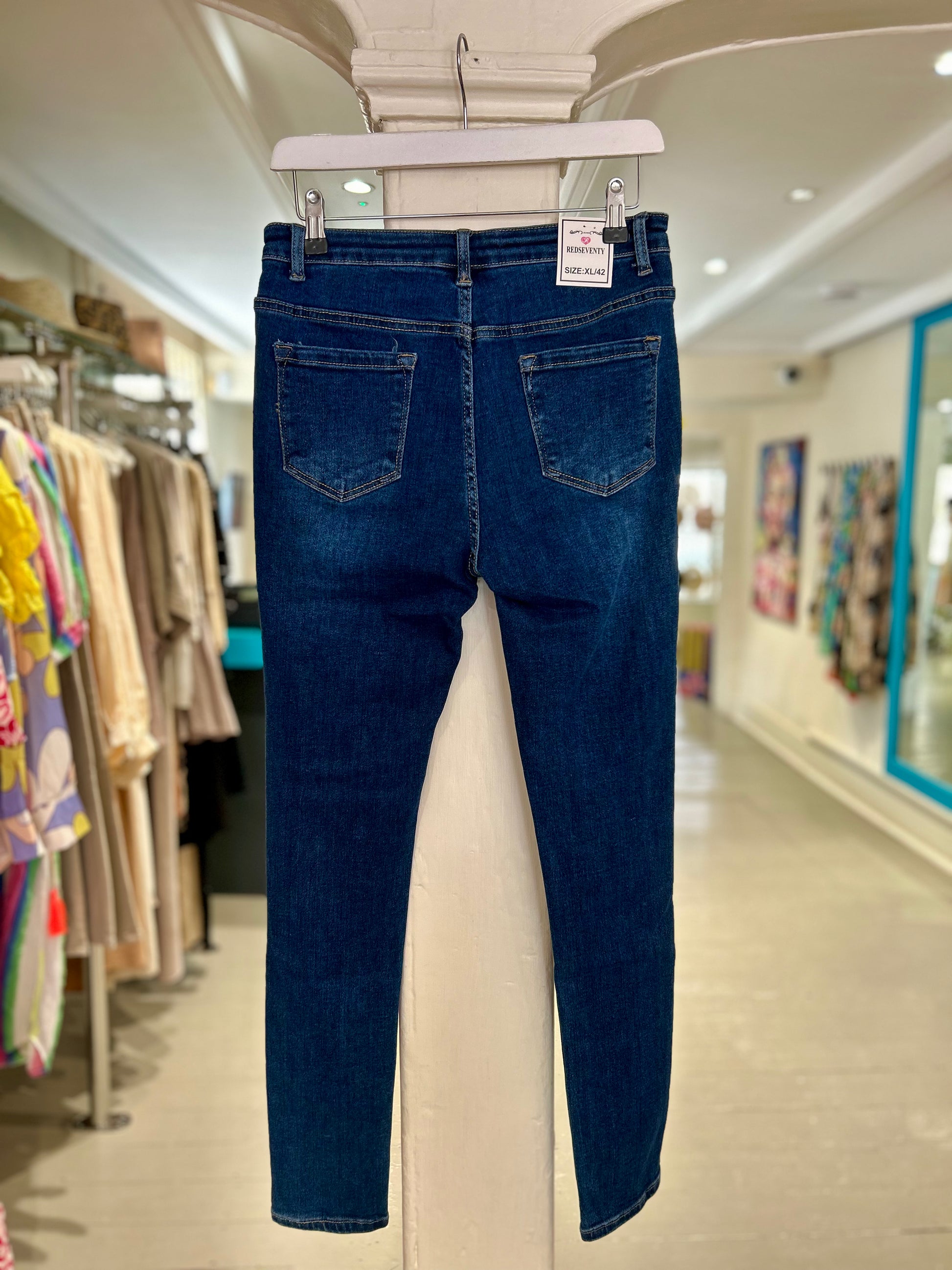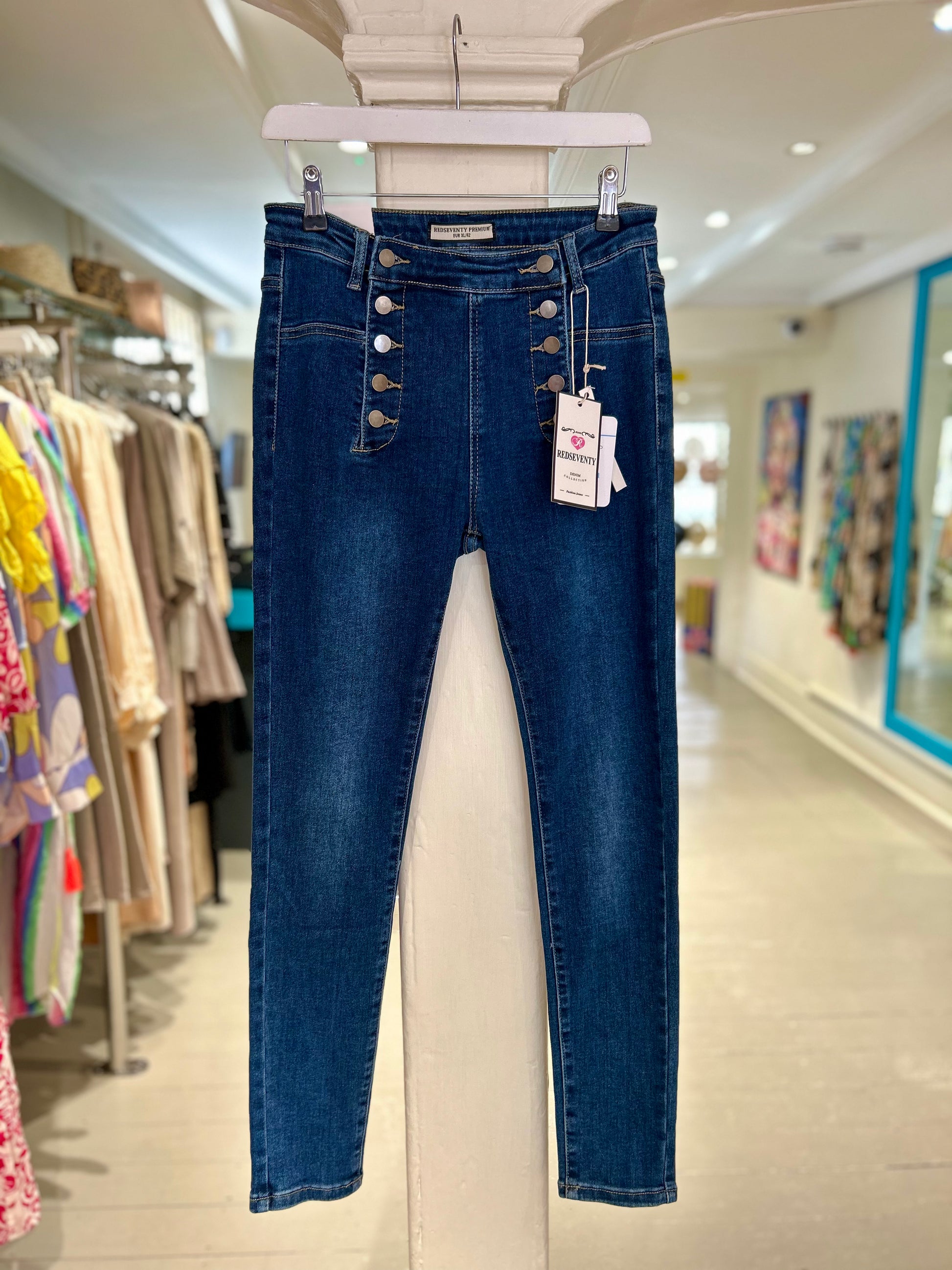 Elevate your style with our High Waisted Skinny Jeans. The classic dark wash and unique button details give a flattering and sophisticated touch to any outfit. With a high waist and skinny fit, these jeans provide a modern and slimming silhouette. Dress them up or down for any occasion.