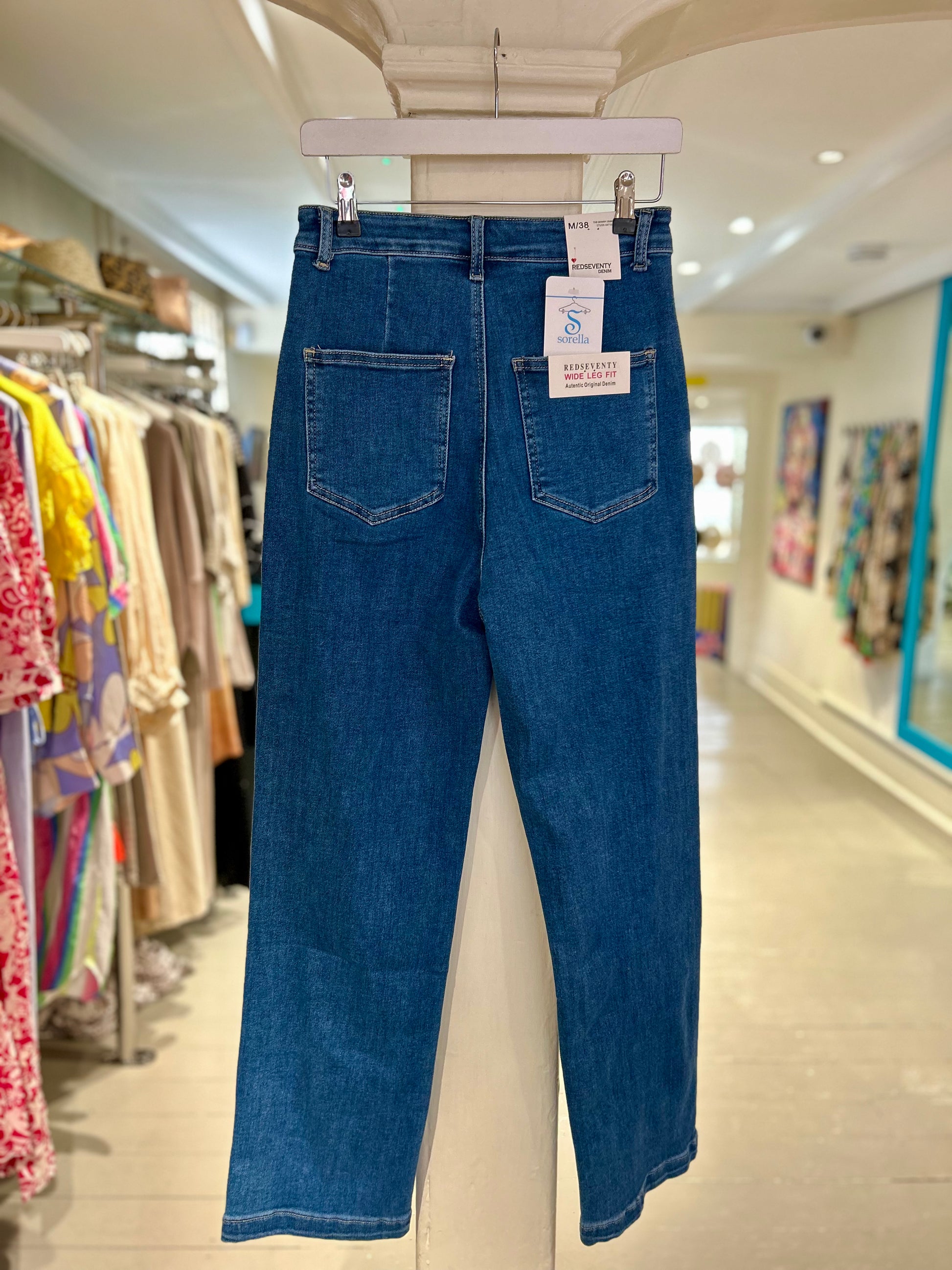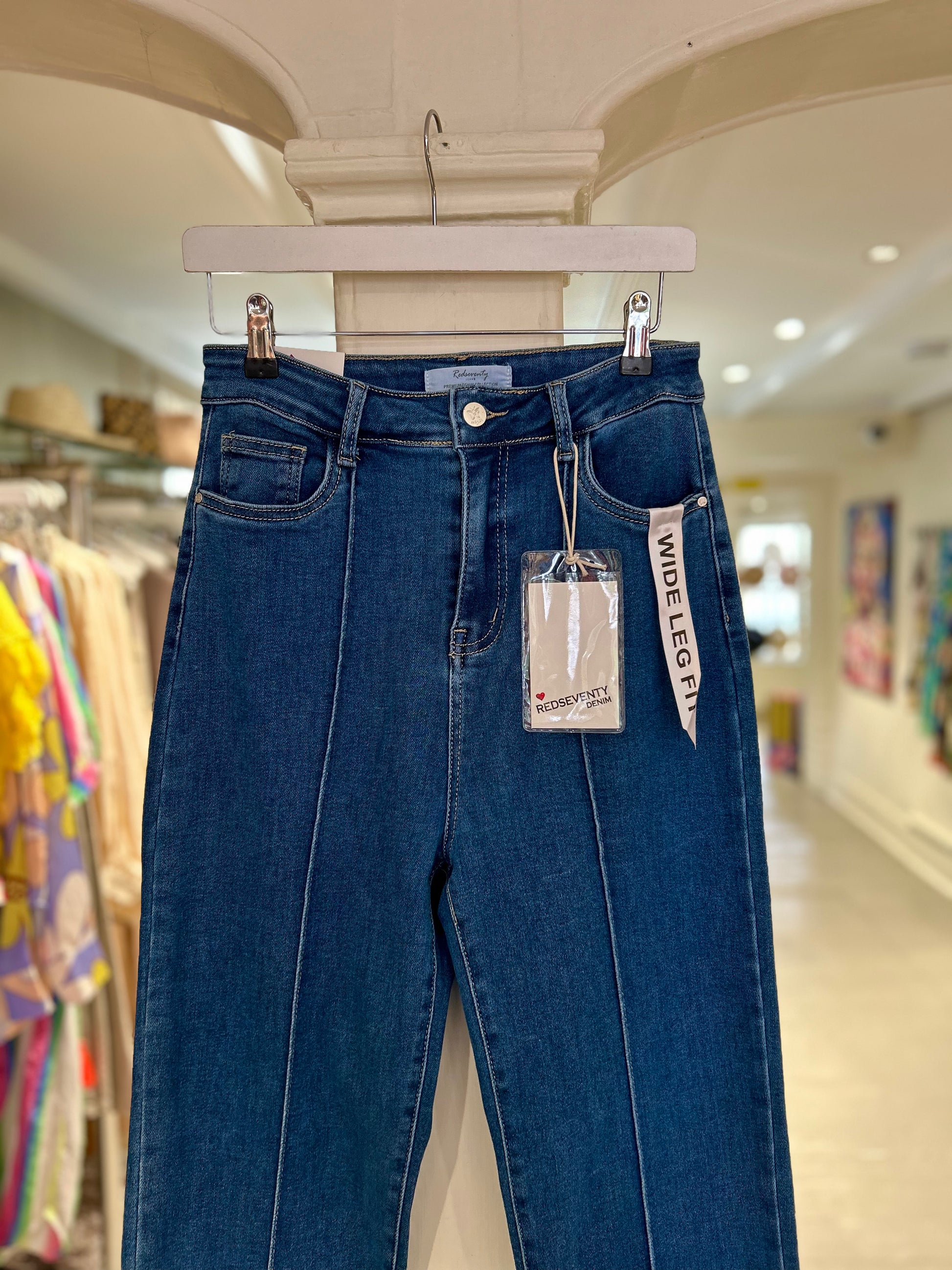 Crafted from high-quality denim, these dark wash jeans feature a flattering high waist and wide leg fit, accentuated by a front seam detail. These jeans offer both style and comfort, making them a versatile addition to any wardrobe. Elevate your denim game with these must-have jeans.