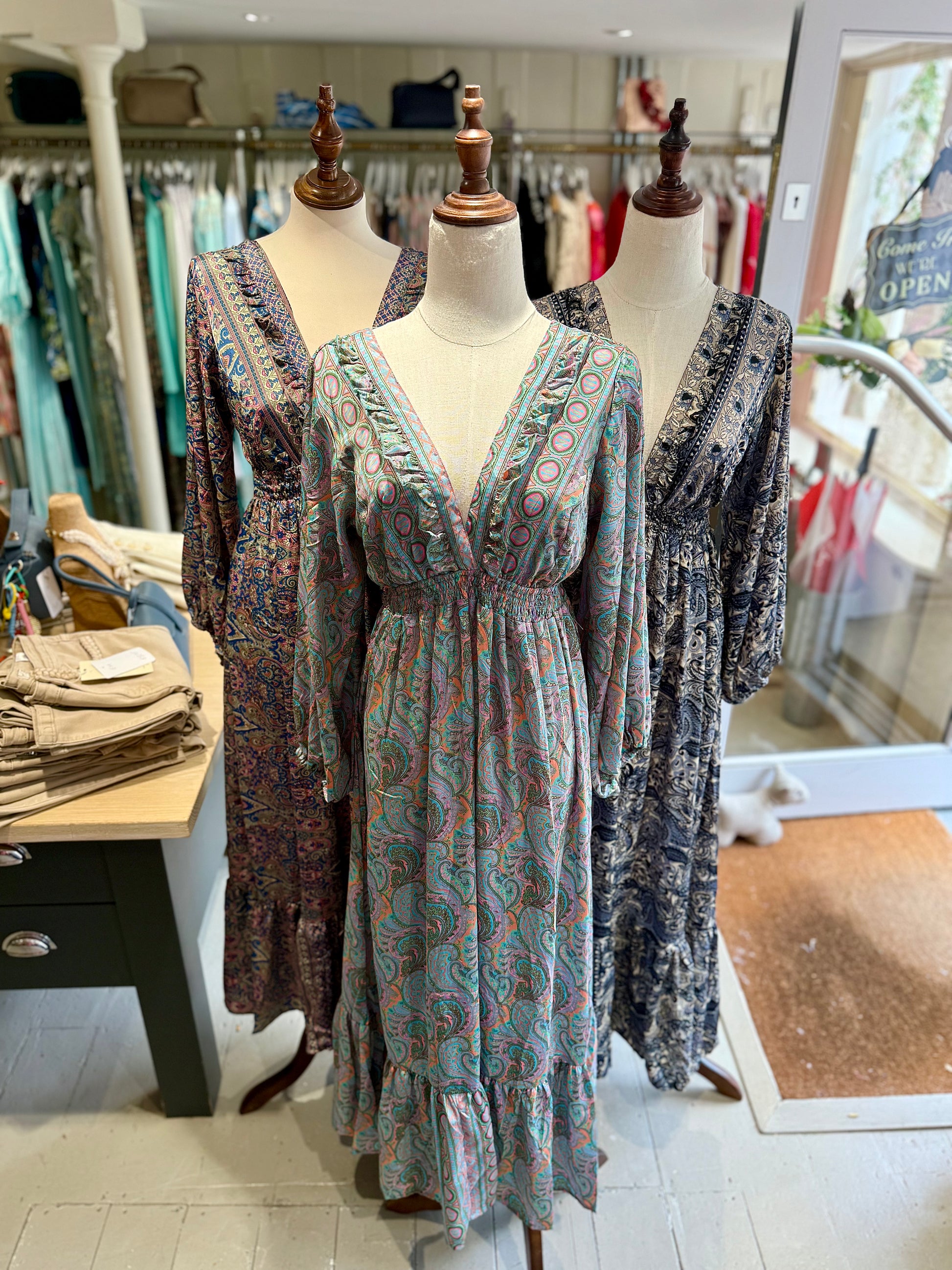 This elegant long sleeve silk maxi dress features a luxurious patterned silk fabric that drapes beautifully for a refined silhouette. The adjustable back ribbons allow you to customise the fit, ensuring comfort and flattering shape. Available in multiple colour ways.