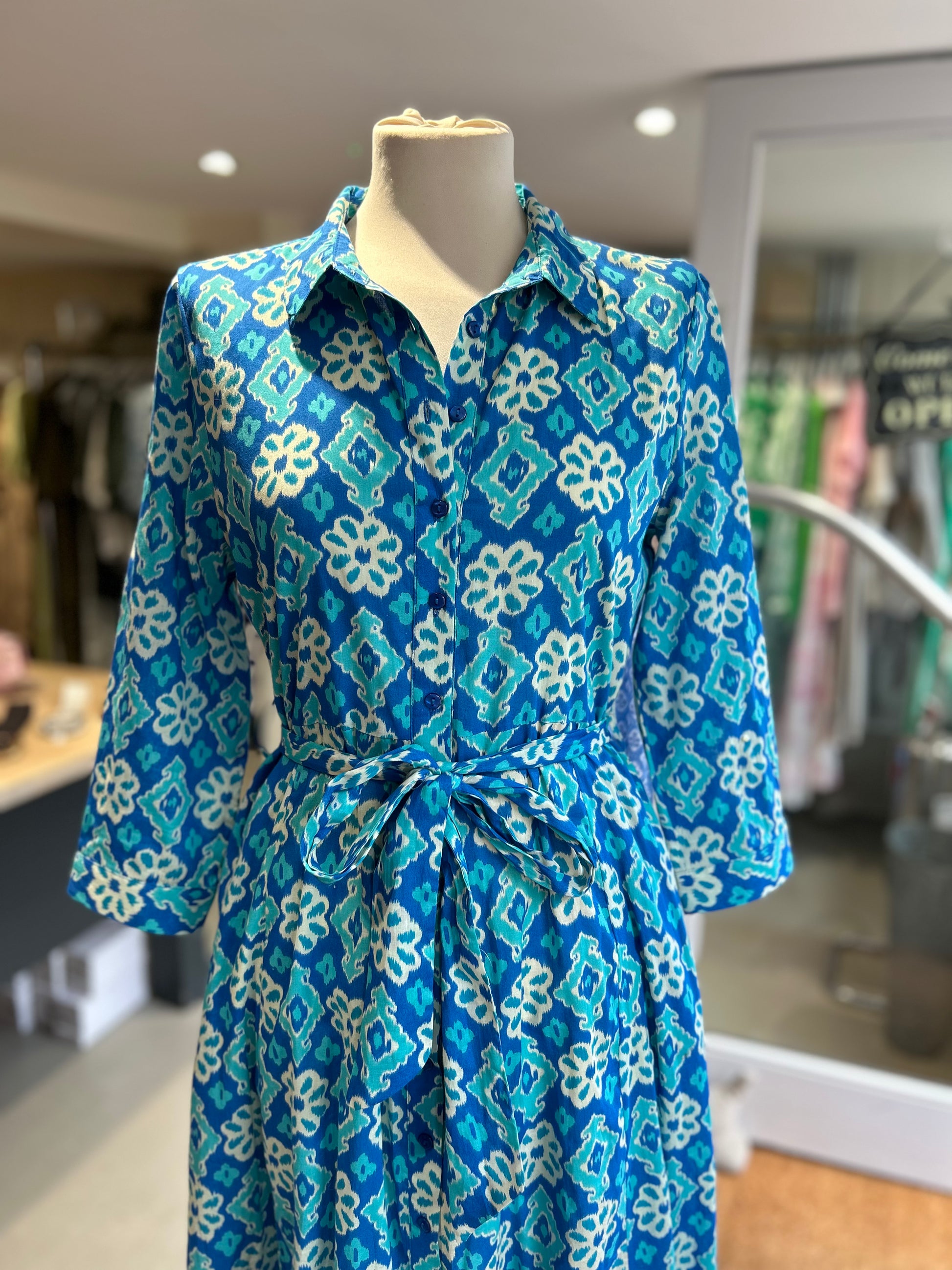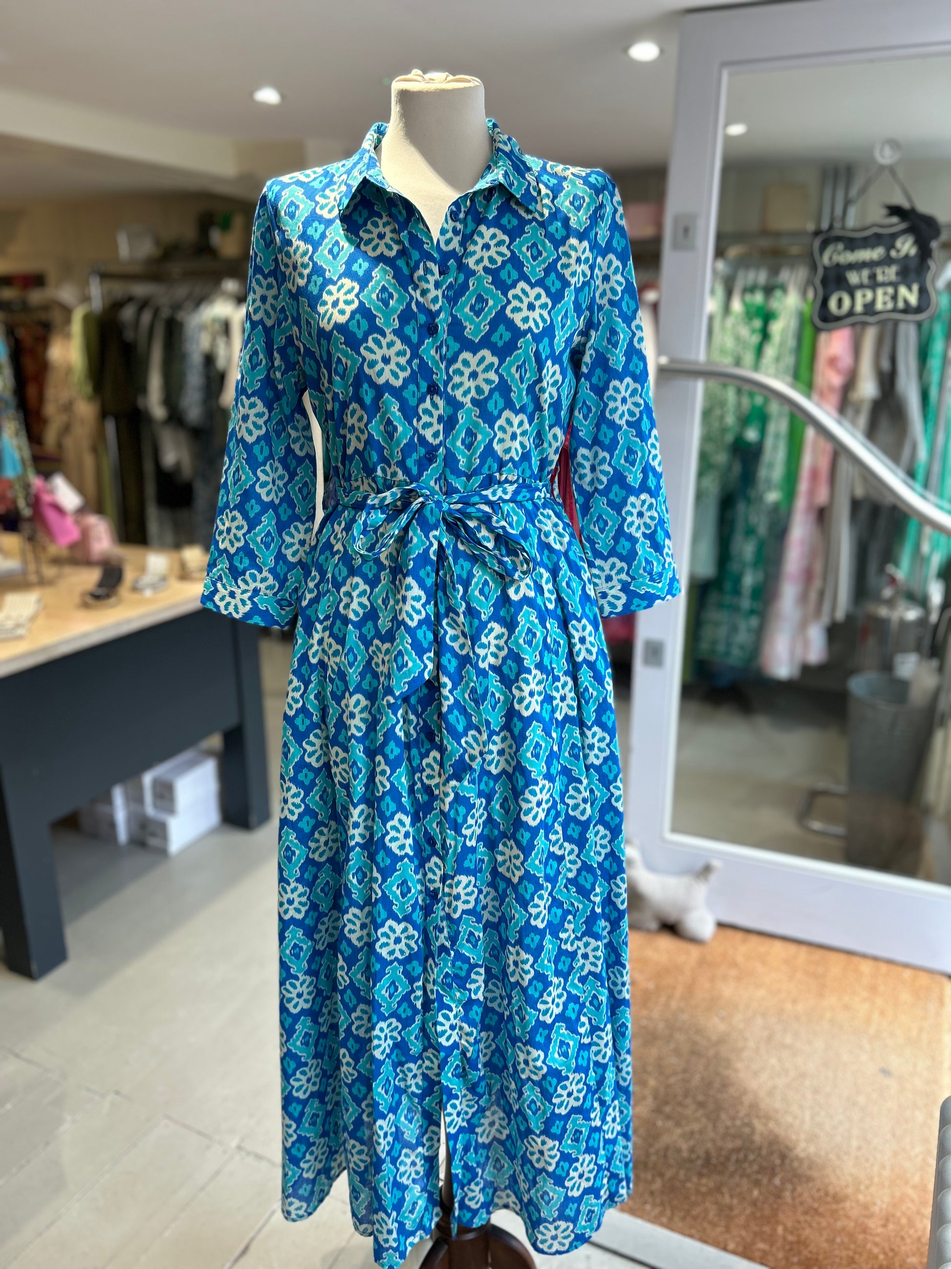 Mid-Sleeve Button Down Patterned Shirtdress - Turquoise & Sky Blue