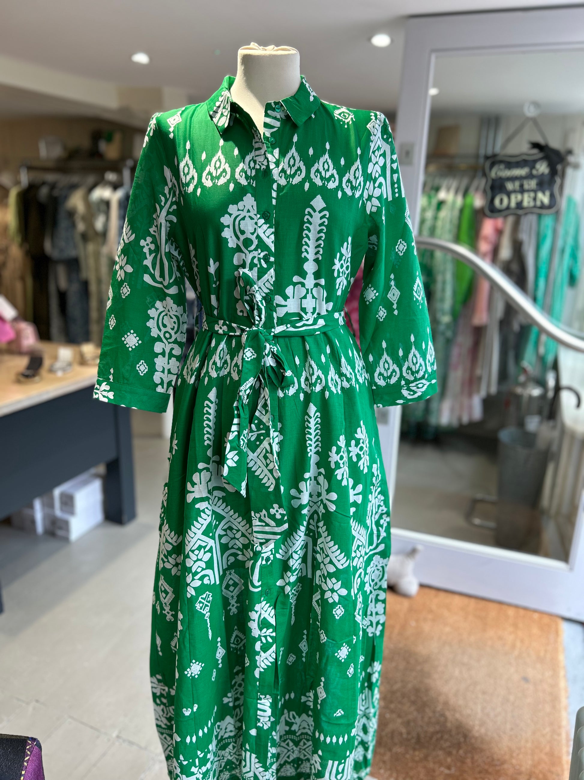 This Mid-Sleeve Button Down Patterned Shirtdress in Tropical Green & White effortlessly combines style and comfort. The mid-sleeves and button-down design offer a classic look, while the tropical green and white pattern adds a touch of fun. Perfect for any occasion, this dress is sure to become a staple in your wardrobe.